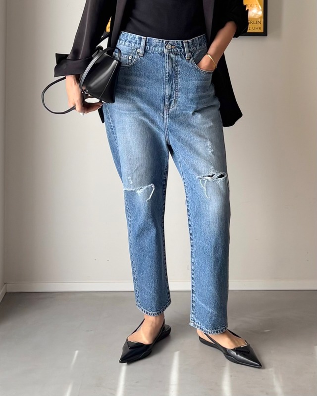 ※坪田あさみさん(身長170cm)着用サイズ:画像1〜6枚目は24インチ、7枚目以降は25インチを着用しています。 ※ウェストやヒップ周りの大きいルーズフィットスタイルのデニムです。 「もうデニムに悩まない」 体型にもしっくりくる、抜け感ときちんと感のバランス。 坪田あさみさんとのコラボで生まれた、“大人が選ぶ”デニムの決定版です。 ⚠️ 在庫切れの前に確保をお勧めします <ファッションエディター坪田あさみさんコラボ> 洗練された大人のカジュアルスタイルにぴったりの<SALUU> サルー。 ストレッチ生地を使っていないからこそのしっかりとした履き心地と、ルーズフィットでゆったりとした着心地が魅力です。 シンプルながらもモダンなデザインは、どんなトップスとも相性抜群。 メンズライクな古着風の手の込んだ加工が施されています。腰ではくと古着風のムード、ウエスト位置ではくとハイウエストになり、脚長効果が◎ 太めストレートに見えますが、実はとても考え抜かれた凝ったパターンで、ほかにない独特の形状が特徴。 このシルエットによりおなかまわりがとても楽なのにすっきり見え、かつヒップラインも太ももや脚の形を一切拾わず、まるで男性がデニムをはいている時のような、まっすぐなラインに見えるようになっています。 この「SALUU」はおなかからヒップ、クロッチ部分のパターンを研究することで、見た目のかっこよさと快適性を両立しています。仕事やお出かけ時はもちろん、家の中でリラックスする時にも着用できるほど楽ちん。 「大きなサイズのヴィンテージデニムをボーイフレンドから借りて着ている」感じ。そのためにウエストではなく、腰まで落としてはけるような仕様にしているのです。ただ腰ではくとはいえ、昔のローライズデニムとはまったく違います。 ※モニター環境により、実際の商品と色味が異なる場合がございます。 ※ルーズフィットスタイルのデニムなヒップやウェスト周りはやや大きくなります。 <サイズ> 【23】 ウェスト:73㎝ / ヒップ:89㎝ / 股上 / 35.8㎝ / 股下:70cm / 渡り幅:28.8㎝ / 膝幅:25.5㎝ / 裾幅25㎝ 【24】 ウェスト:75.5㎝ / ヒップ:92㎝ / 股上36.3㎝ /股下:70cm / 渡り幅:29.5㎝ / 膝幅:26㎝/ 裾幅25.5㎝ 【25】 ウェスト:78㎝ / ヒップ:94.5㎝ / 股上36.8㎝ / 股下:72cm / 渡り幅:30.2㎝ / 膝幅:26.5㎝/ 裾幅26㎝ 【26】 ウェスト:80.5㎝ / ヒップ:97㎝ / 股上37.3㎝ / 股下:72cm / 渡り幅:31㎝ / 膝幅:27㎝/ 裾幅26.5㎝ 【27】※オンラインストア限定サイズ ウェスト:83㎝ / ヒップ:99㎝ / 股上37.8㎝ / 股下:74cm / 渡り幅:32㎝ / 膝幅:27.5㎝/ 裾幅27㎝ 【28】※オンラインストア限定サイズ ※NEW SIZE ウェスト:85.5㎝ / ヒップ:102㎝ / 股上:38.4㎝ / 股下:74cm / 渡り幅:32.5㎝ / 膝幅:28㎝ / 裾幅:27.5㎝ 【29】※オンラインストア限定サイズ ウェスト:88㎝ / ヒップ:104㎝ / 股上39㎝ / 股下:76cm / 渡り幅:33㎝ / 膝幅:28.5㎝/ 裾幅28㎝ ※サイズ27Inchはオンラインストア限定! ※サイズ28Inchはオンラインストア限定! ※サイズ29Inchはオンラインストア限定! お問い合わせ品番:WB24314-MID BLUE この商品は予約アイテムです。 ※ファブリックや洗い加工による収縮率の違いによりサイズが異なる場合がございます。 <原産国> MADE IN JAPAN <お取り扱いのご注意> ・この製品は特殊な染色や加工により1点1点の色やサイズなどに違いがございます。商品の特性として他にはない独特の風合いをお楽しみください。 ・部分的な糸切れ、生地切れ、染ムラ等は商品の特徴です。 ・強い日光や照明を受けますと色褪せることがございます。光の当たる場所での保管は避け、洗濯の際は日陰に干してください。 ・素材の性質上、色が落ちやすいので、他のものと一緒に洗わないでください。 ・摩擦により他の衣類や淡い色のベルトやバッグ、履物等に色が付着することがあります。 ・この製品は、ボタンやリベットなどの金属部品を使用しております。その部品で対象物や人体にキズやケガを負わせる可能性がありますのでお取扱いにはご注意ください。また、火気・暖房器具の近くにおりますと金属部分が熱くなりますのでご注意ください。