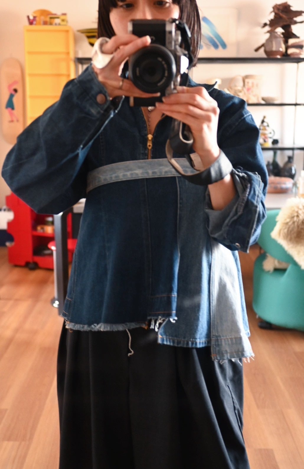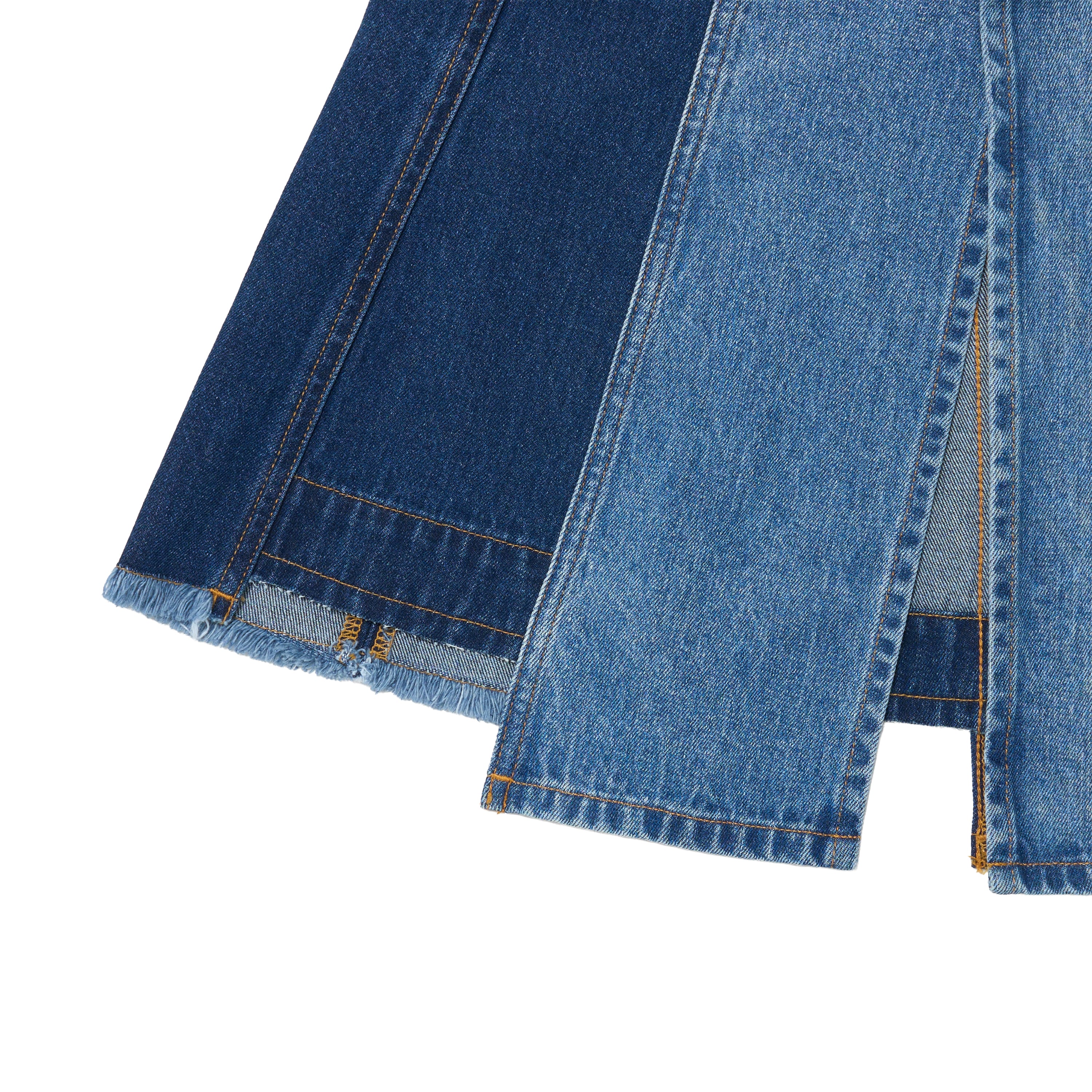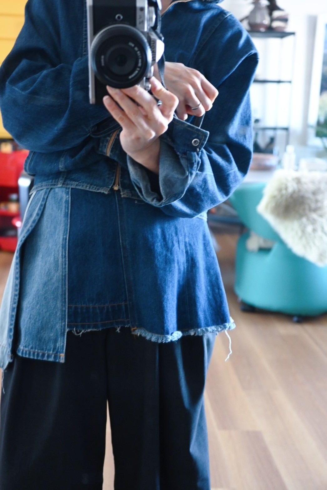 濃淡の異なるデニムを大胆に切り替え、あえて色差を際立たせることで、古着ならではのムードを表現。パーツごとに表情が異なり、どこか一点もののような存在感を放ちます。