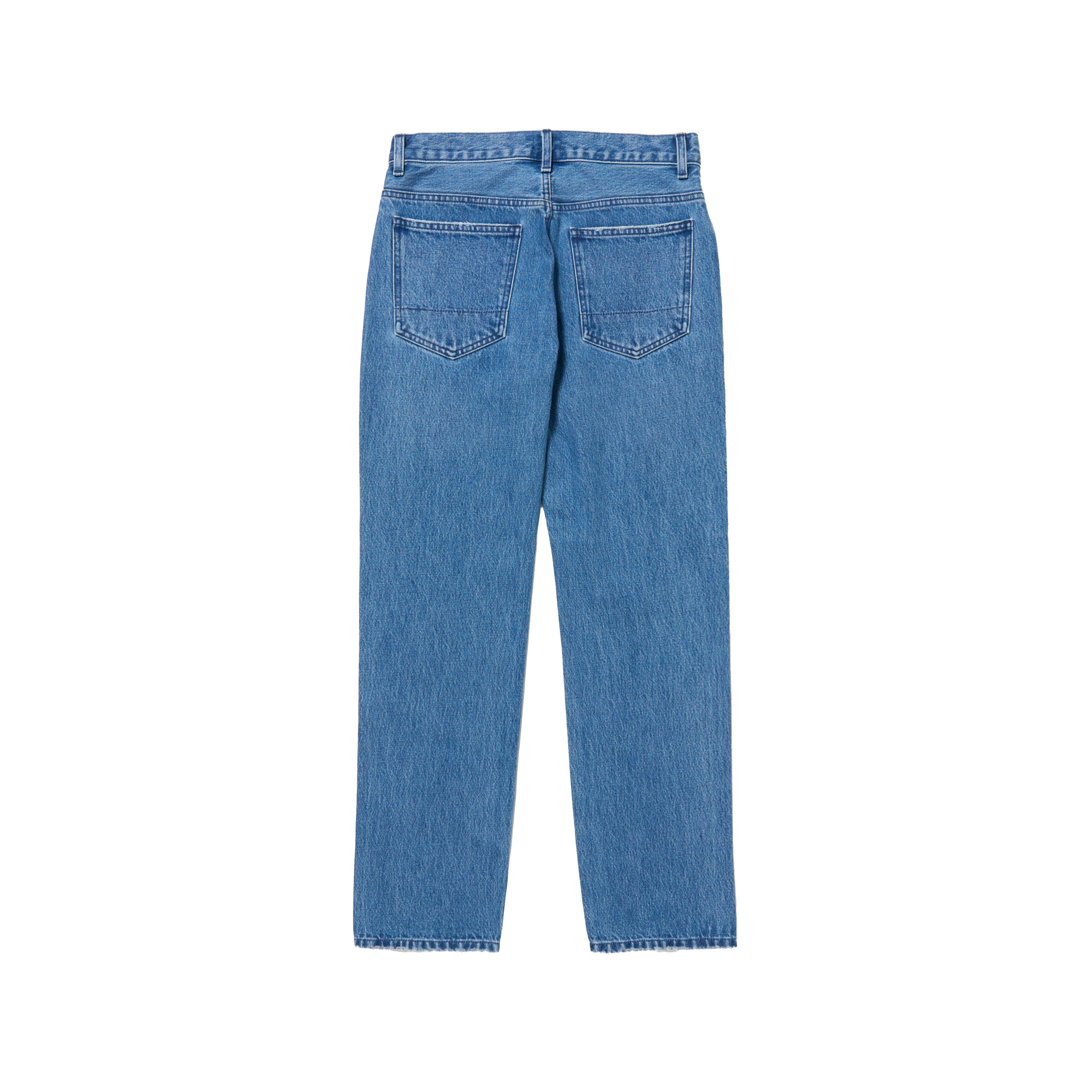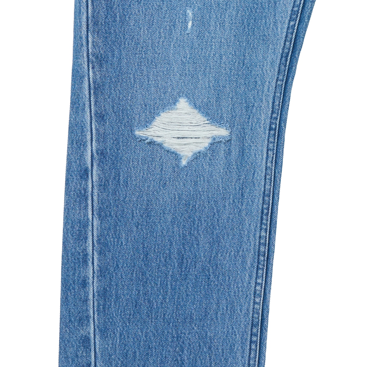 目を引くヴィンテージブルーは、海外縫製 × 国内加工ならではの奥行きある色落ちと、膝部分にほどこしたクラッシュ加工がポイント。ヴィンテージデニムを知る人ほど唸る、リアルな風合いを追求しました。